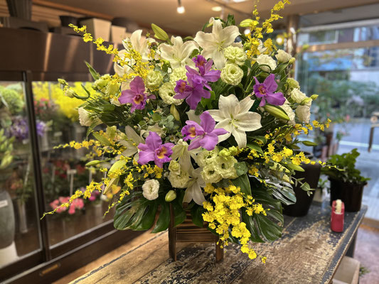 カゴにお花を活けたアレンジメントは、花瓶のいらない手軽さが人気です。そのまま飾っていただけます。